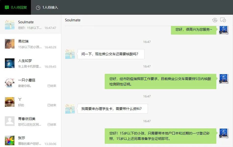 8月份升級(jí)開(kāi)通網(wǎng)絡(luò)人工客服,市民通過(guò)荊門(mén)公交微信公眾號(hào),與人工客服1號(hào)、2號(hào)坐席進(jìn)行溝通,建立起集咨詢(xún)、尋物、建議、投訴等一體化的綜合在線服務(wù)。