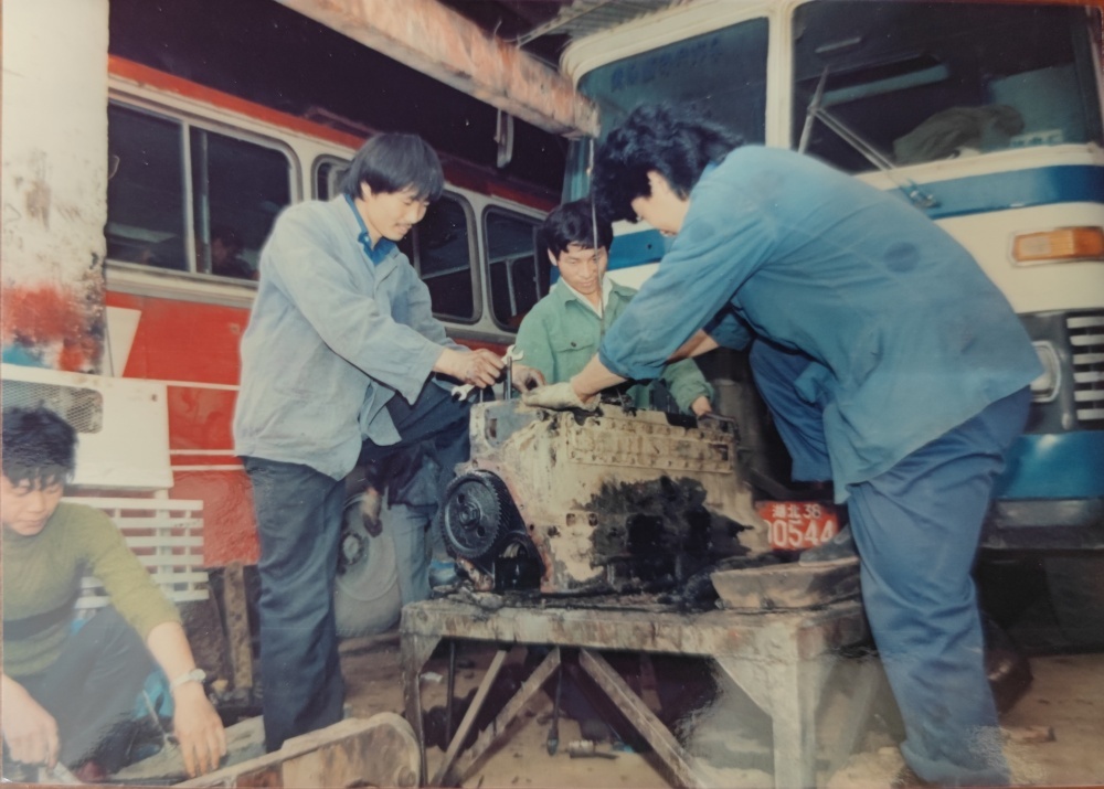 ▲80年代,車(chē)間修理工檢修模樣。3個(gè)機(jī)修工一同修理著車(chē)輛發(fā)動(dòng)機(jī),臉上沒(méi)有吃力感,更像是帶著興趣在專(zhuān)研。