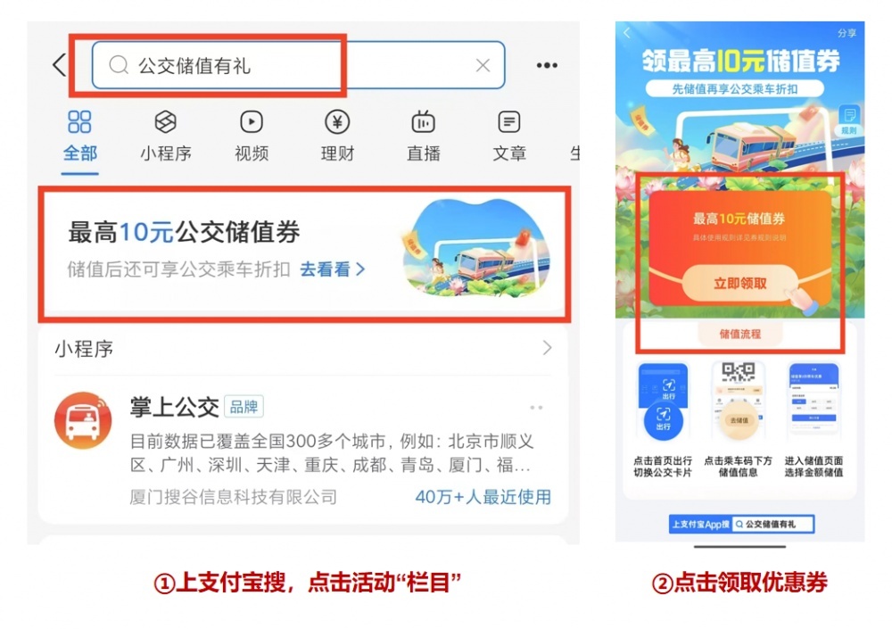 如何領(lǐng)取【儲值立減券】:活動期間,上支付寶搜索【公交儲值有禮】或掃描下方二維碼,進(jìn)入活動頁面,點(diǎn)擊“立即領(lǐng)取“,即可免費(fèi)領(lǐng)取公交儲值優(yōu)惠。