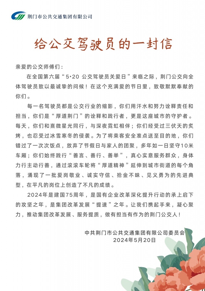 為倡導(dǎo)社會(huì)關(guān)愛(ài)公交駕駛員,營(yíng)造理解、尊重公交駕駛員的良好氛圍,5月20日,市公交集團(tuán)以“全國(guó)公交駕駛員關(guān)愛(ài)日”為契機(jī),通過(guò)一系列關(guān)愛(ài)駕駛員的活動(dòng),為公交駕駛員們送上節(jié)日祝福和關(guān)愛(ài)。