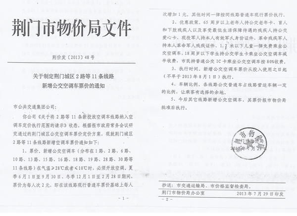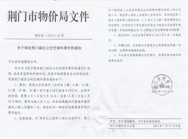 根據(jù)荊門市物價局《關于制定荊門城區(qū)公交空調(diào)車票價的通知》(荊價發(fā)[2013]46號)及《關于制定荊門城區(qū)2路等11條線路新增公交空調(diào)車票價的通知》(荊價發(fā)[2013]48號),公交空調(diào)車2014年6月1日至9月30日營運時段內(nèi)執(zhí)行2元/人次票價,現(xiàn)就執(zhí)行公交空調(diào)車票價后的有關事項公告如下: