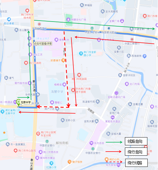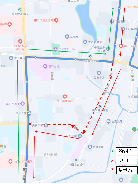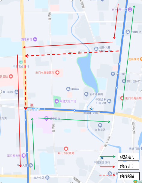 調(diào)整后新增停靠站點(diǎn):瀏河橋(西側(cè))、金寧小區(qū)(西側(cè))、荊門電視臺(tái)(西側(cè))、鳳臺(tái)社區(qū)(北側(cè))、?;壑袑W(xué)(北側(cè))。